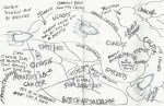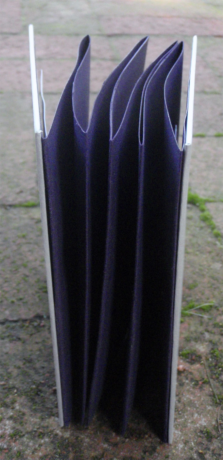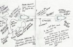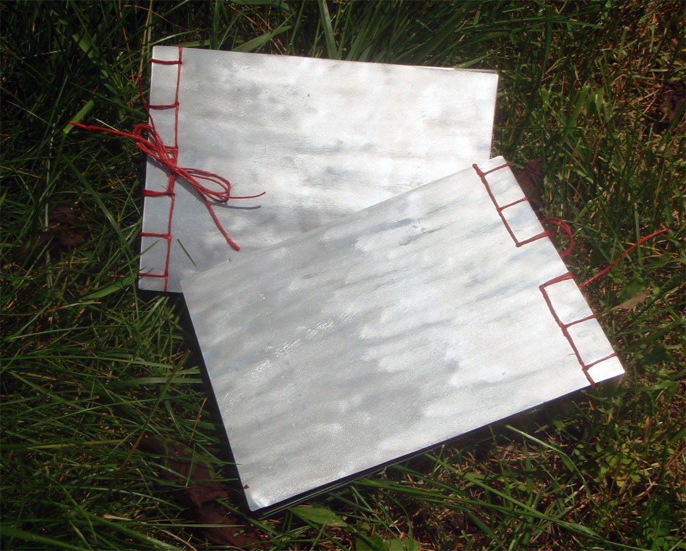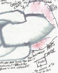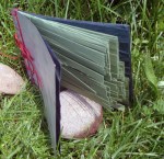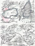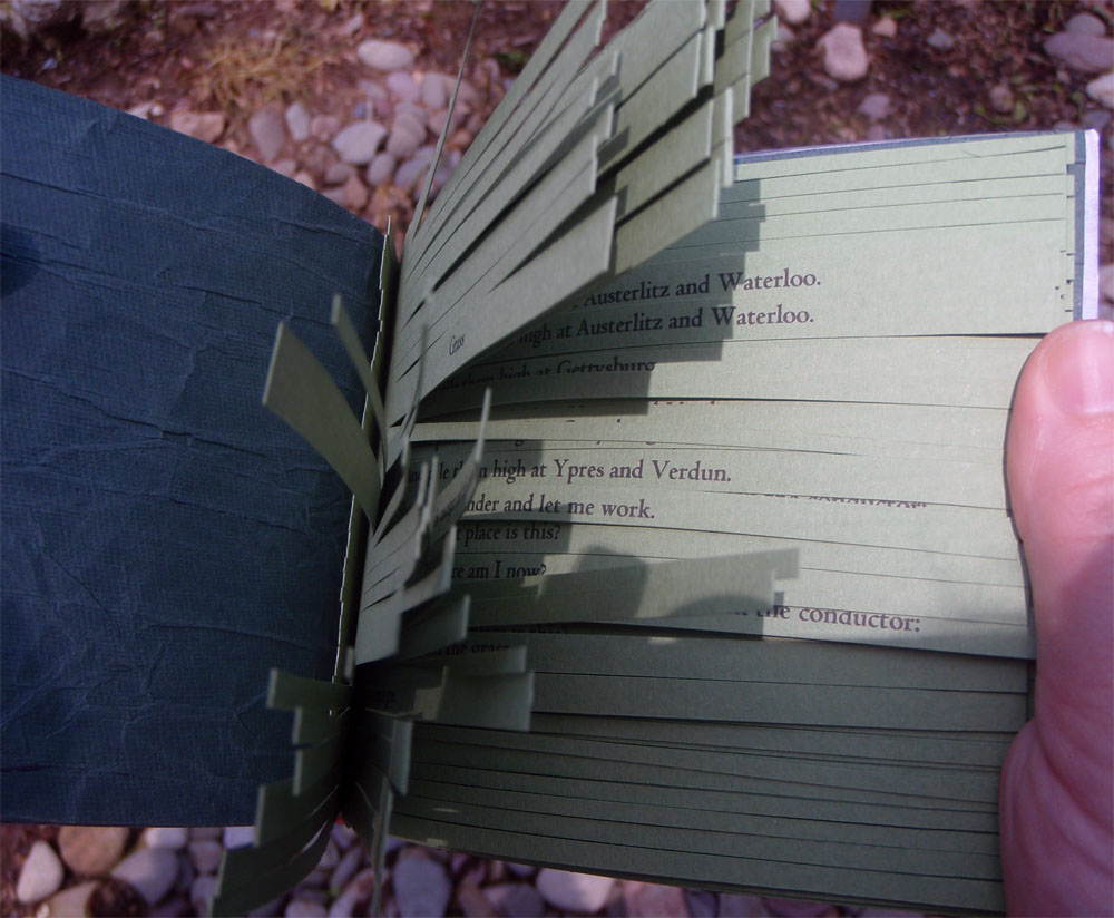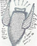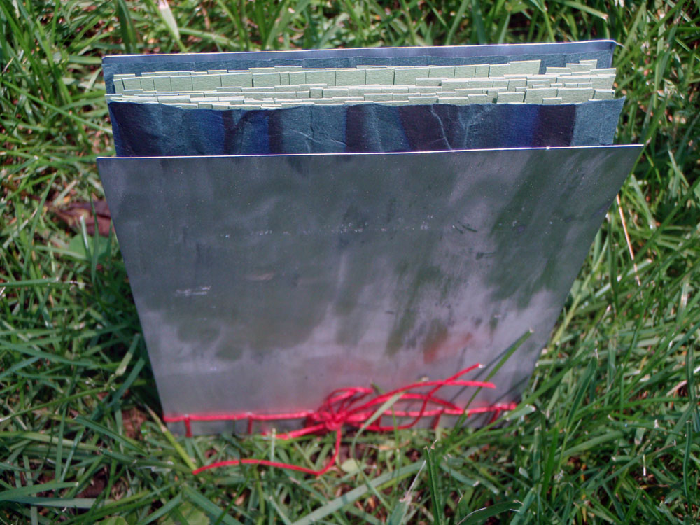 The body of my scroll is hand-dyed cotton. The pattern is a result of paste resist. The imagery consists computer generated iron on transfers (the science!), thread drawings and fabricated journal entries about a father-son hiking trip gone wrong.
