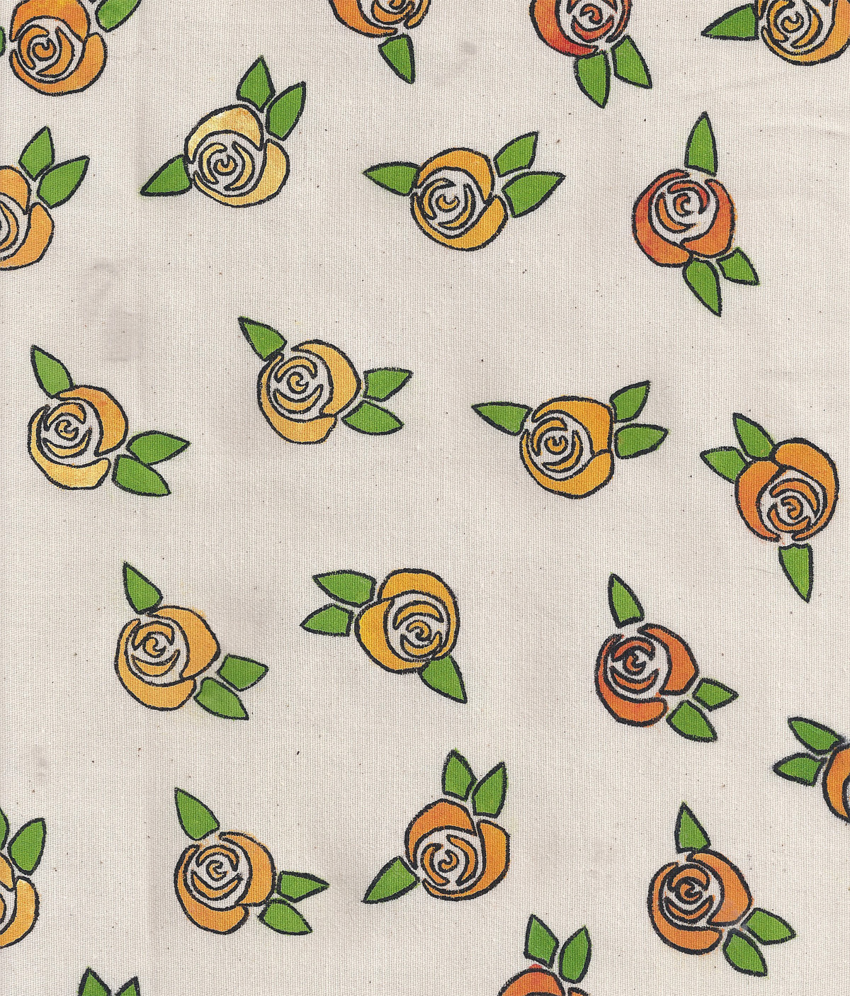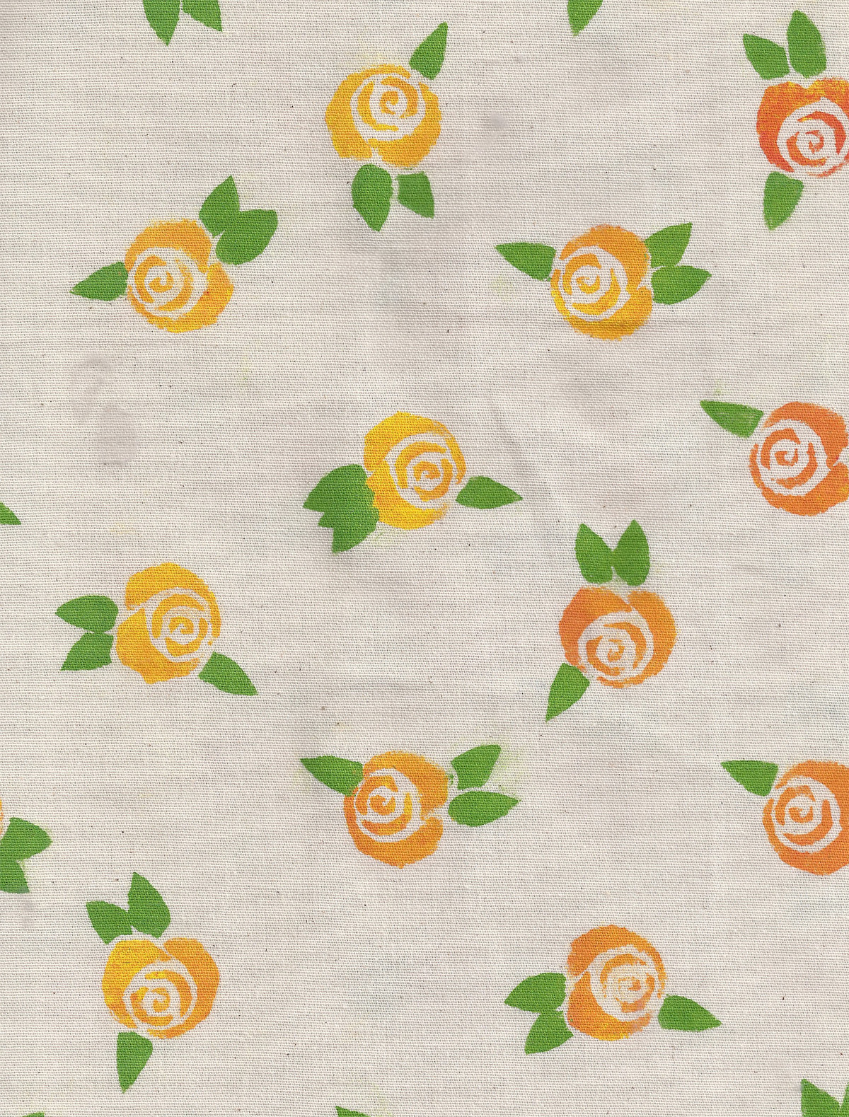 But let’s back up a minute. Although I received this hint well before December, it wasn’t completed and sent until February. Wait a moment, you say, didn’t you just claim this project was a breeze? Weeelllll, the sewing part was. The picking out the perfect fabric part took me over a month. In the end, I decided to create my own textile design. I cut a small rose stencil from quilter’s template plastic and chose medium weight unbleached cotton to print on. Using a mixture of acrylic and screen printing ink, I sponged paint through my stencil in a somewhat random (yet intentional) pattern. Once it was dry I applied the leaves in the same manner. Then I heat set it with the iron.