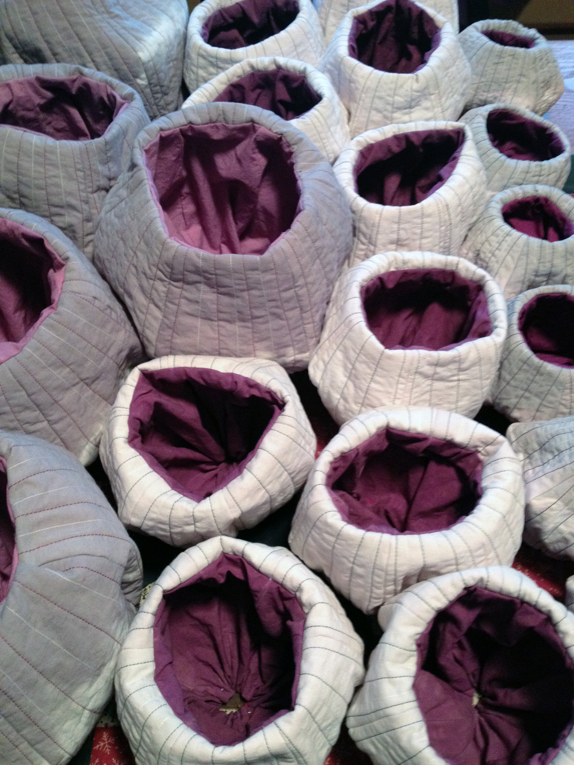 And now with a secure vision and two weeks until the install date I had to manufacture 35 softly structured hexagons of various sizes, complete with lining and batting. That’s 630 pieces of fabric. They needed to be cut, tied, dyed, adorned and sewn. Totally under control.