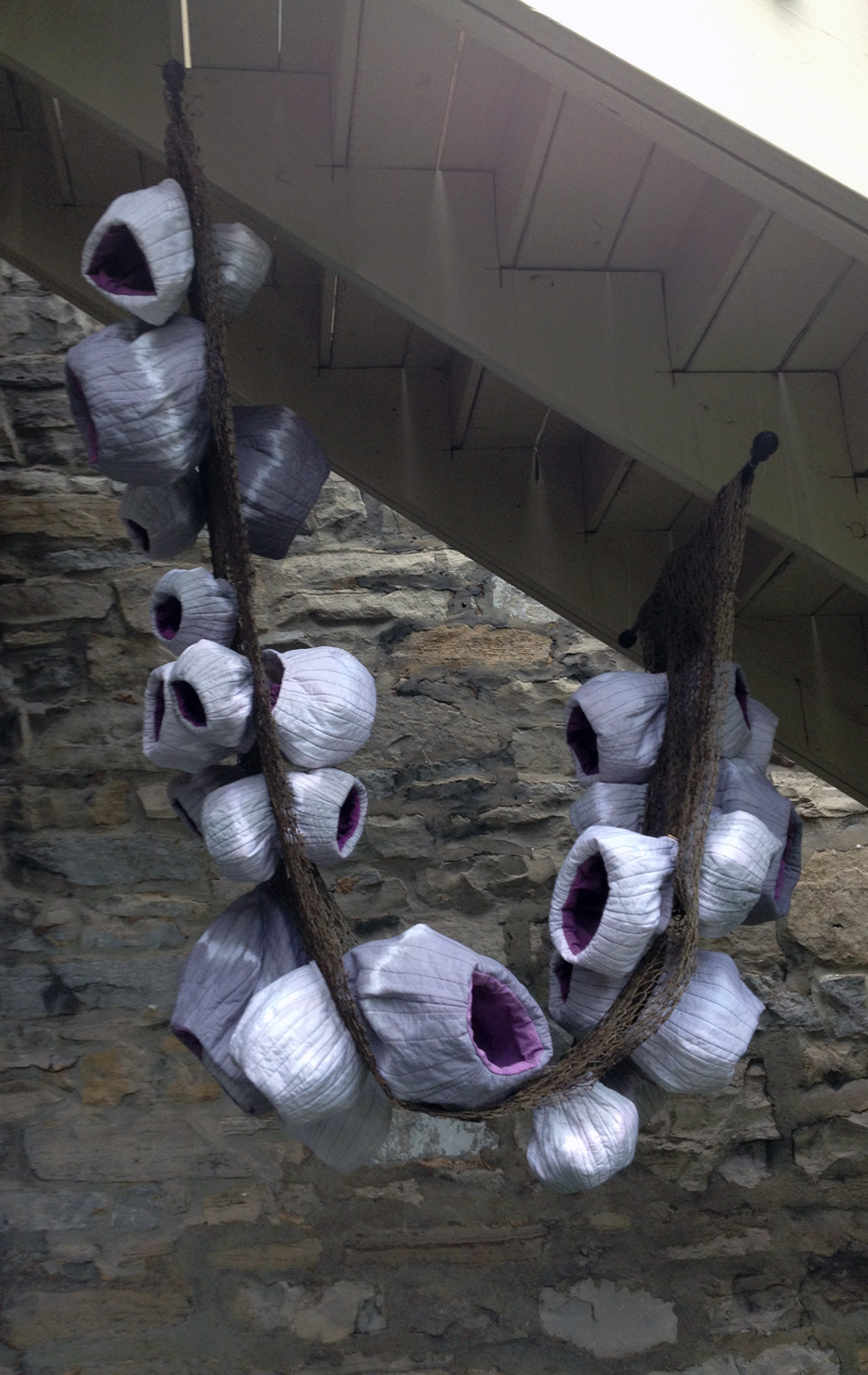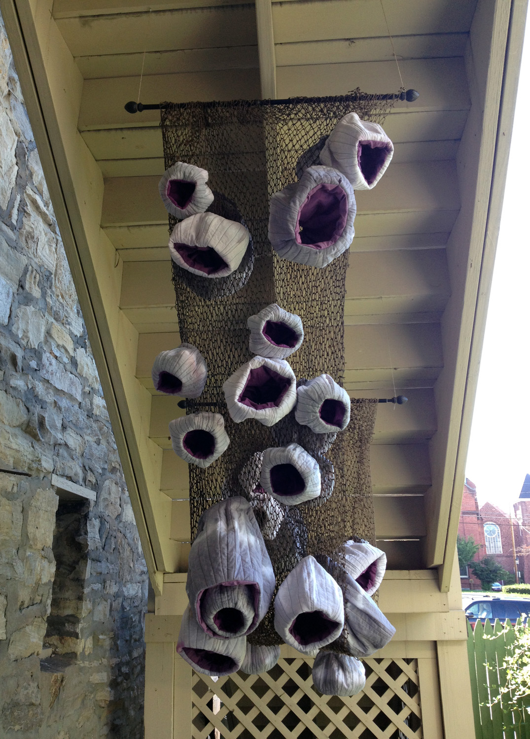 In June the gallery manager and curator of the Bellefonte Art Museum asked if I had a textile piece I would like to install in their Sharon McCarthy Memorial Garden. I said “Yes, I would love to,” knowing that I had nothing appropriate. After all, I had three months. It was an unusual space, outside and under a staircase.