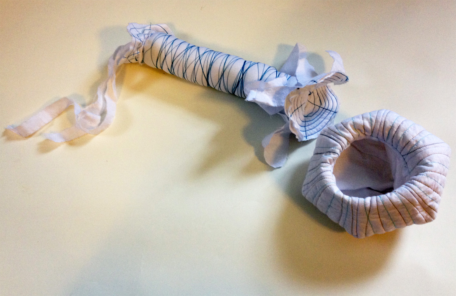I thought about it in an abstract sense for the first two months. In the meantime I took road trips to the Outer Banks and Indiana, started talking to my estranged ex and accepted a full time job as a social worker. At month three I realized belatedly, I didn’t want to make a two dimensional piece. In an unrelated thought process (Oh, but it’s all related) I was reflecting about how difficult it was to place many ocean creatures as flora or fauna. I immediately decided to make something reminiscent of sea tubes and barnacles. Unfortunately, my mock ups were a little too reminiscent of other animal parts. A lot of artists explore sexuality and the duality of the masculine and feminine, but I had just inadvertently mocked up a strap-on and a fleshlight. After an emergency critique from a friend, the tube got tossed and the fleshlight became a sessile suspension feeder once again.